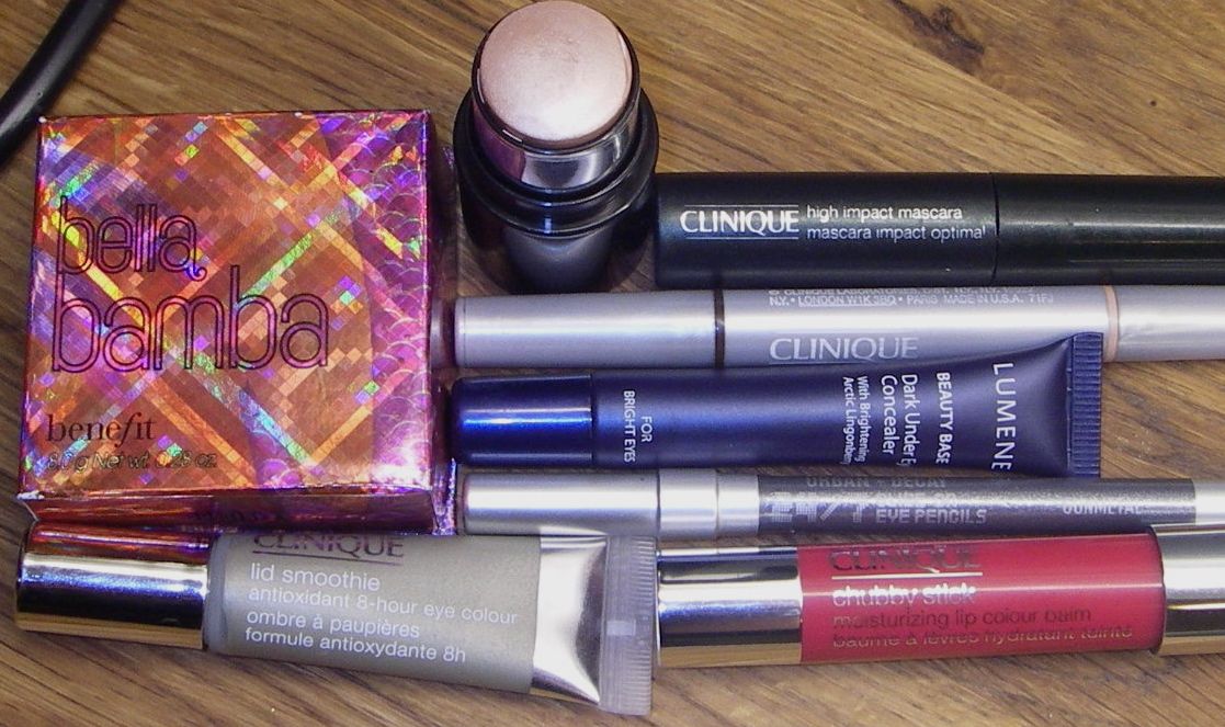 Ni ser: rouget Bella Bamba (färgprov här!) från Benefit, IsaDoras Glow Stick i färgen 09 Gold Vanilla (färgprov här!), High Impact Mascara och Instant Lift for Brows från Clinique, Beauty Base Dark Under Eye Concealer från Lumene, 24/7 glide-on eye pencil i Gunmetal från Urban Decay och nyshoppade Clinique Chubby Stick i Chunky Cherry.